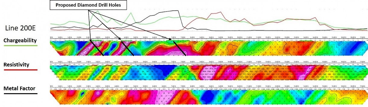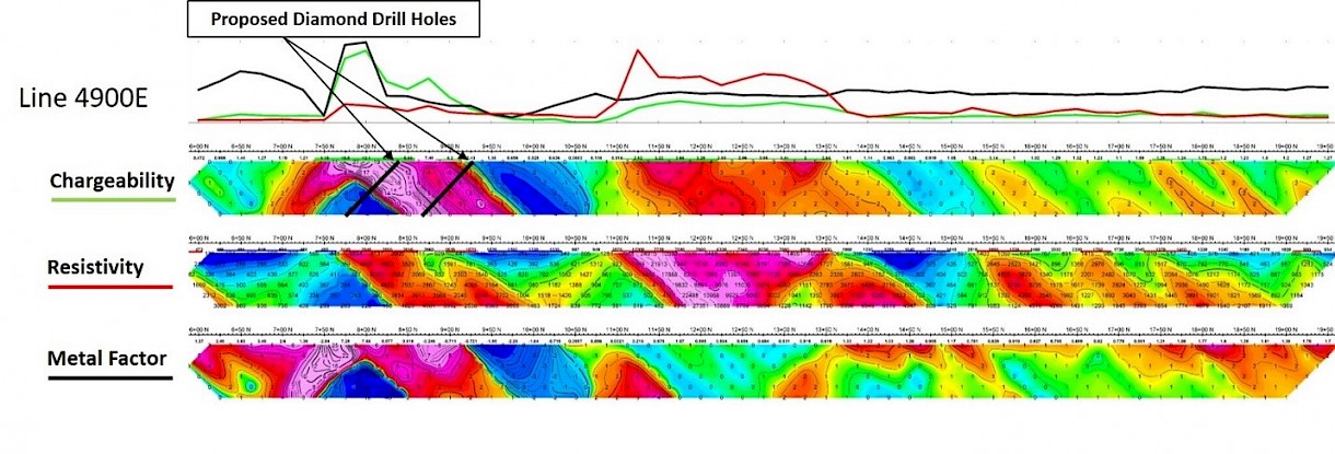 IP pseudo section from the Kwai property West Grid showing three of the proposed drill hole