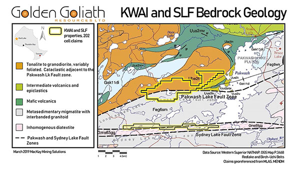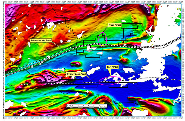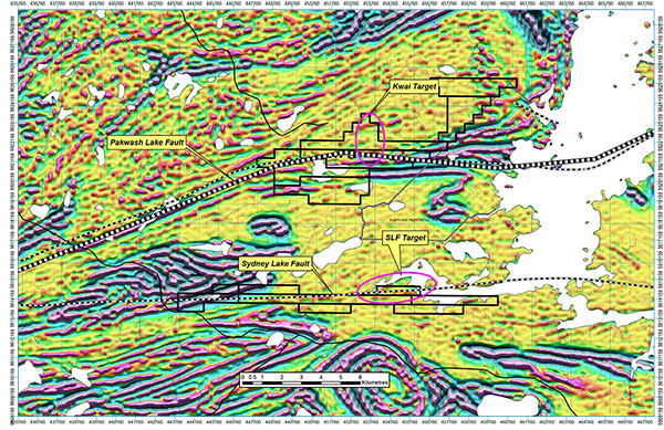 The SLF property is underlain by metasediments (gneisses) of the English River subprovince that are cut by the Sydney Lake fault. Work to date has outlined anomalous gold features on the property, primarily through MMI soil geochemistry and lake sediment geochemistry in Pakwash Lake. These anomalies in an underexplored area are the first steps in looking for Eleonore-type mineralization near the subprovince boundary.